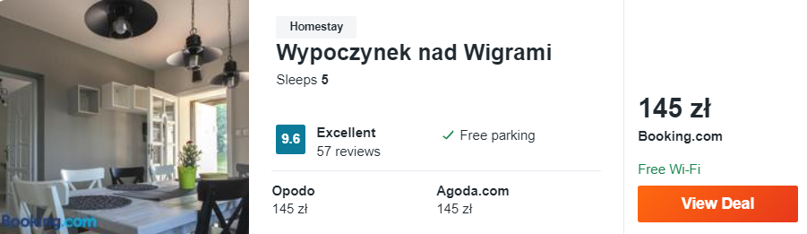Dowiedzcie się więcej o tym hoteluDecydując się na noclegi w agroturystyce Wypoczynek nad Wigrami nie dość, że otrzymacie bardzo dobre warunki zakwaterowania, to pobyt spędzicie w bliskim sąsiedztwie dwóch jezior: Pietry oraz Wigry. Obiekt od centrum Suwałk oddalony jest o ok. 12 km.