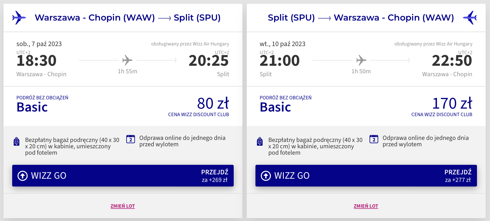 Na Bałkany udasz się z lotniska w Warszawie w terminie 7-10 października. Do Splitu i z powrotem polecisz na pokładzie samolotu linii Wizz Air. Bilety w najniższej cenie dostępne są dla członków Wizz Discount Club. Chętni na loty bez WDC zapłacą nieco więcej.
