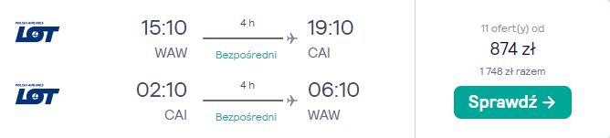 Do Egiptu polecisz w dogodnym terminie obejmującym weekend (czwartek – poniedziałek) 18 – 22 maja. Czeka cię bezpośredni lot z Warszawy do Kairu, realizowany na pokładzie samolotu PLL LOT. Bilety w najniższej cenie zarezerwujesz w ramach trwającej Wielkiej Promocji PLL LOT.