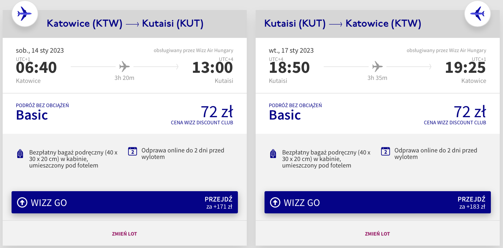 Do Gruzji udasz się w terminie 14-17 stycznia (sobota-wtorek). Czeka cię bezpośredni lot z Pyrzowic, realizowany na pokładzie samolotu linii Wizz Air. Bilety w najniższej cenie zarezerwują posiadacze Wizz Discount Club, pozostałe osoby zapłacą nieco więcej.
