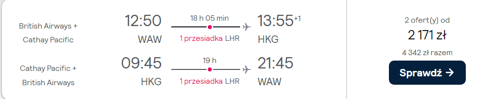 Do Azji udasz się z warszawskiego lotniska im. Chopina w terminie 4(5)-11 marca. W obie strony polecisz na pokładach samolotów linii British Airways oraz Cathay Pacific z wygodnymi przesiadkami w Londynie. W cenie biletu zabrać ze sobą możesz bagaż rejestrowany (nadawany do luku) podręczny oraz jeden przedmiot osobisty (mały plecak lub damską torebkę).
