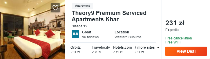 Na czas waszego pobytu w Mumbaju proponuję wam noclegi w Theory9 Premium Serviced Apartments Khar. To świetnie oceniany obiekt, który zlokalizowany jest w pobliżu najważniejszych atrakcji miasta. Apartament jest klimatyzowany, posiada prywatną łazienkę i kompleksowe wyposażenie.