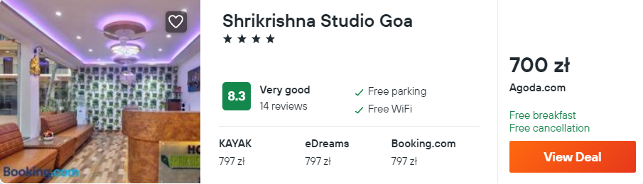 W Azji zakwaterowani będziecie w hotelu Shrikrishna Studio Goa. Do waszej dyspozycji będzie pokój z prywatną łazienką oraz basen zewnętrzny. W cenę noclegów wliczono śniadania.