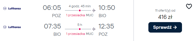 Do Hiszpanii wybierzesz się w terminie 12 – 17 października. Do Bilbao możesz polecieć Lufthansą z Rzeszowa, Wrocławia, Poznania, Katowic, Gdańska, Warszawy lub Krakowa.