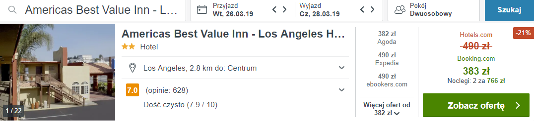 W Los Angeles, pierwsze dwie oraz ostatnie dwie noce proponuję spędzić w Americas Best Value Inn – Los Angeles. To jeden z bestsellerów sprzedaży. Obiekt oferuje pokoje z bezpłatnym WiFi, które wyposażone są we wszystkie udogodnienia, które gwarantują wygodny pobyt.