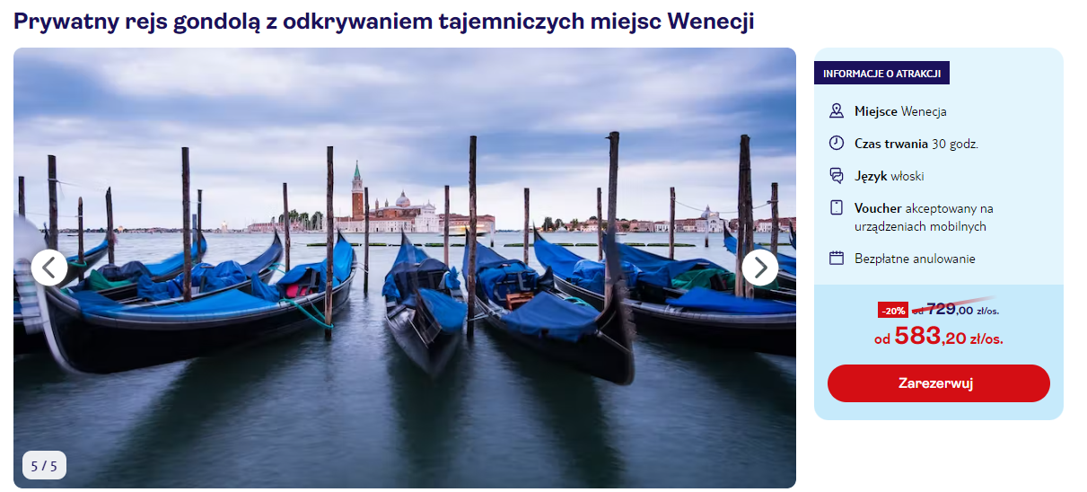 Wizyta w mieście nie może obyć się bez wycieczki po jego kanałach! Zarezerwuj prywatny rejs gondolą z odkrywaniem tajemniczych miejsc Wenecji, by zobaczyć niezwykłe oblicze tego regionu.