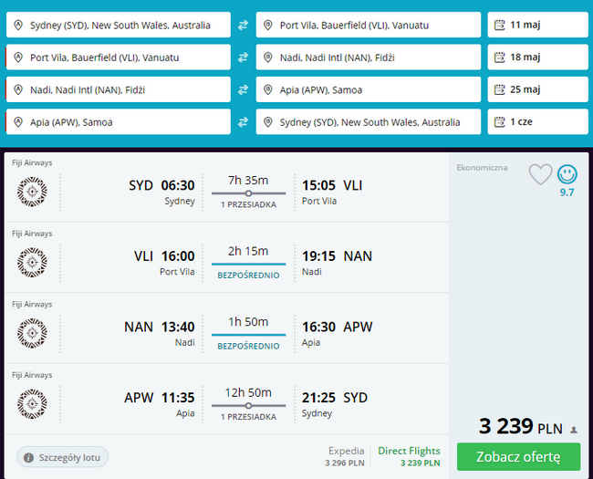 Fiji Airways | Sydney 06:30 – Port Vila (Vanuatu) 15:05 | 3239 PLN | 11 maja