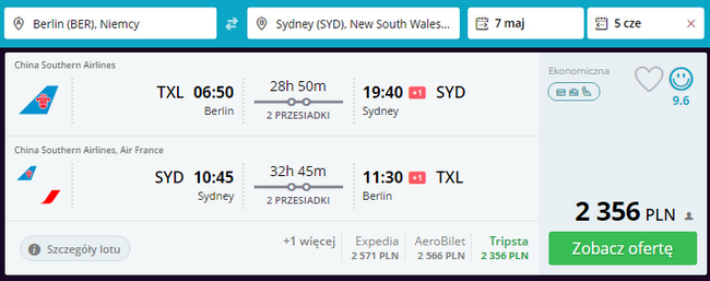 China Southern Airlines | Berlin 06:50 – Sydney 19:40 | 2356 PLN | 7 (8) maja