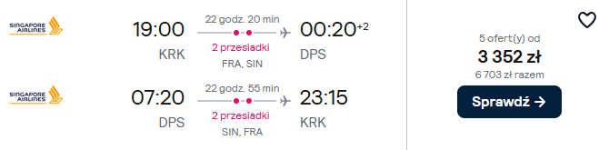 Na Bali polecisz z Krakowa w terminie 5(7) – 19 listopada. Po drodze przesiądziesz się we Frankfurcie (do niego dolecisz Lufthansą) i w Singapurze. „Główny”, czyli najdłuższy odcinek podróży pokonasz na pokładzie Airbusa A380 Singapore Airlines – największego pasażerskiego samolotu świata.