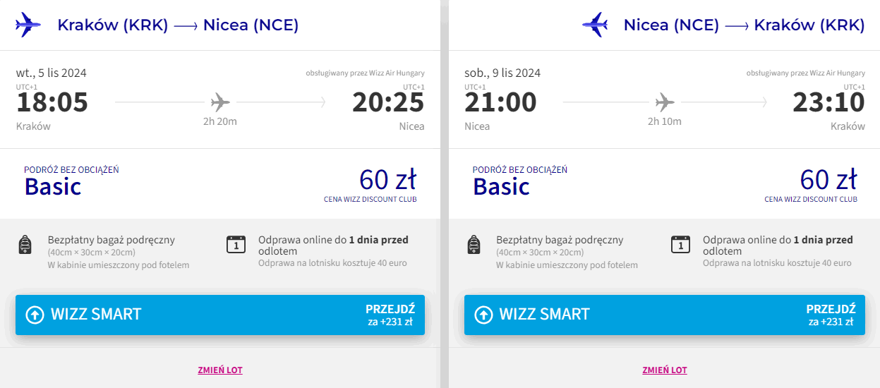 Na Lazurowe Wybrzeże udasz się z lotniska Kraków-Balice w listopadzie. W obie strony polecisz linią Wizz Air z bagażem podręcznym. Bilety w najniższej cenie dostępne są dla członków Wizz Discount Club. Chętni na loty bez WDC zapłacą więcej.