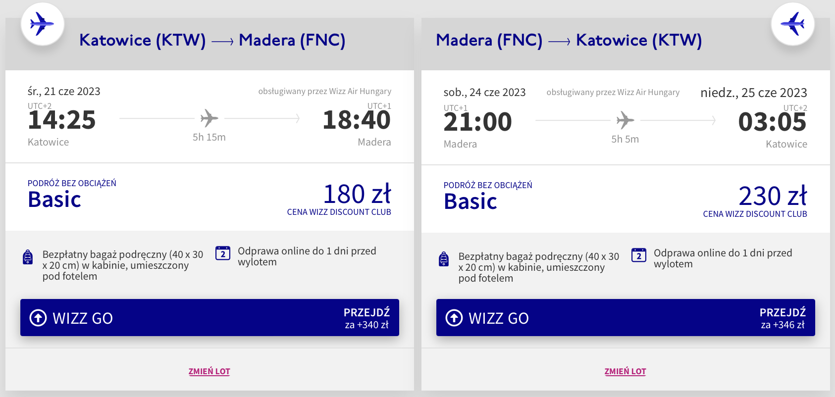 Do Portugalii udasz się z katowickiego lotniska w Pyrzowicach w terminie 21-24 czerwca. W obie strony polecisz na pokładzie samolotów linii Wizz Air z wliczonym małym bagażem podręcznym. Bilety w najniższej cenie dostępne są dla członków Wizz Discount Club. Chętni na loty bez WDC zapłacą więcej.