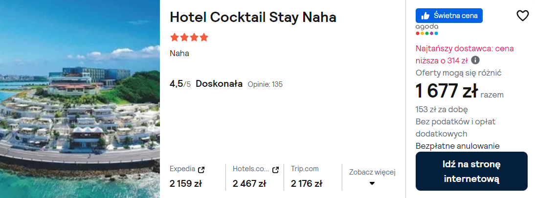 Na Okinawie polecam ci noclegi w 4* hotelu Cocktail Stay Naha. Każdy pokój wyposażony jest w klimatyzację, telewizor LCD, lodówkę oraz czajnik elektryczny. W łazience jest prysznic, suszarka do włosów oraz podstawowe przybory toaletowe.