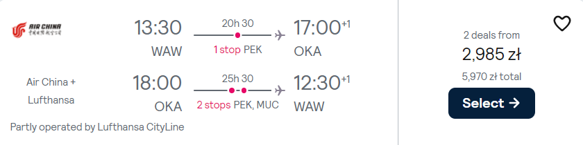 Na japońską wyspę udasz się z warszawskiego lotniska im. Fryderyka Chopina na przełomie maja i czerwca. W obie strony polecisz linią Air China i Lufthansą z bagażem rejestrowanym (nadawanym do luku), podręcznym oraz przedmiotem osobistym. Po drodze czekać cię będą przesiadki w Pekinie oraz jedna w Monachium – w drodze powrotnej.