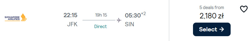 Na początek czeka cię bezpośredni lot z Berlina do Nowego Jorku. Następnie wsiądziesz na pokład samolotu linii Singapore Airlines i ruszysz w prawie 19-godzinną (lot SQ23) podróż z NYC do Singapuru.