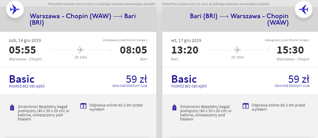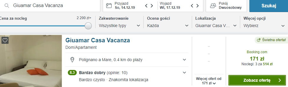 W podróż udacie się w terminie 14-17 grudnia (sobota-wtorek) linią Ryanair. Bilet każdego z was kosztować będzie 118 PLN. Bez dodatkowych kosztów do Włoch udacie się tylko z bagażem podręcznym. Za zakwaterowanie w niezwykle urokliwej miejscowości Polignano a Mare zapłacicie 565 PLN/2 osoby (282 PLN za osobę). W grudniu możecie się spodziewać przyjemnych i znacznie wyższych temperatur niż w Polsce.