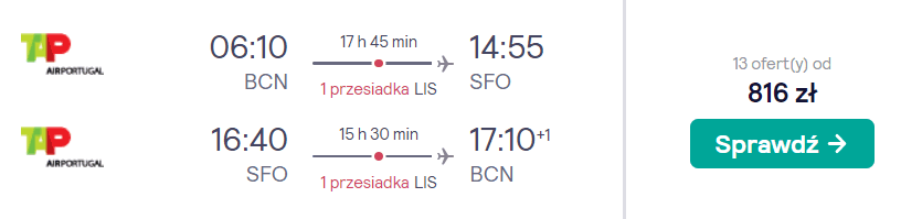 Następnie ze stolicy Katalonii udacie się na zachodnie wybrzeże Stanów Zjednoczonych. W obie strony polecicie na pokładach samolotów linii lotniczej TAP Air Portugal z wygodnymi przesiadkami w Lizbonie.