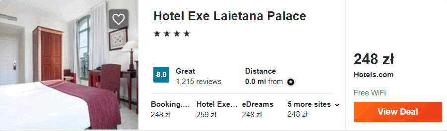 W Barcelonie proponuję wam noclegi w 3* hotelu Exe Laietana Palace, który znajduje się nieopodal portu oraz w odległości 650 metrów od słynnego deptaka La Rambla.