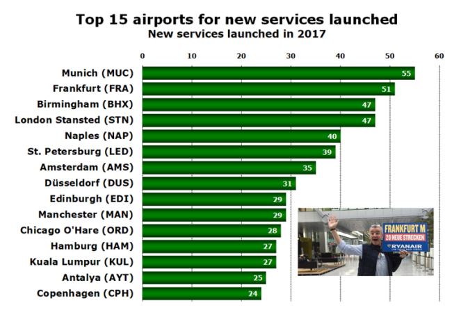 Bardzo ciekawa jest też lista lotnisk, na których w ubiegłym roku uruchomiono najwięcej tras. Aż 11 z 15 miejsc zajmują tutaj porty lotnicze z Europy, a liderami zestawienia są 2 największe lotniska z Niemiec, czyli Monachium (55 nowych tras) i Frankfurt (51), na których w zeszłym roku z dużym rozmachem zadebiutował Ryanair. Z kolei Monachium zyskało najwięcej dzięki Eurowings – tania odnoga Lufthansa uruchomiła z tego lotniska aż 30 połączeń w 2017 roku.