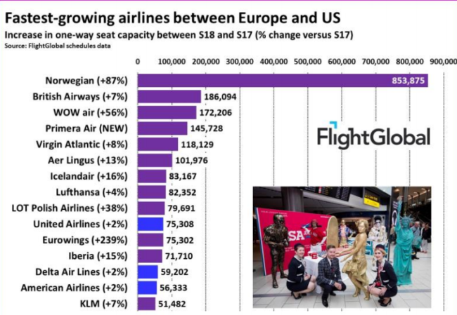 Z analogicznego rankingu dla przewoźników obsługujących loty z Europy do USA wynika, że LOT jest jedną z najszybciej rosnących linii lotniczych w Europie na trasach transatlantyckich.