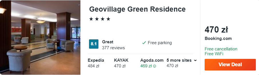 Dowiedzcie się więcej o tym hoteluNatomiast na Sardynii zatrzymajcie się w 4* Geovillage Green Residence, który znajduje się w spokojnej okolicy. Wszystkie apartamenty posiadają aneks kuchenny, miejsce do relaksu i spania oraz łazienkę. Na terenie obiektu znajduje się także darmowy parking dla gości.
