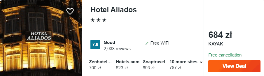 W Porto wybrałem dla was noclegi w słynnym 3* hotelu Aliados. To miejsce, o którym można powiedzieć, że ma duszę: było ono świadkiem wszystkich najważniejszych wydarzeń w XX-wiecznej historii miasta. Trudno również o bardziej centralną lokalizację, dlatego będzie to świetna baza wypadowa do pieszego zwiedzania okolicznych atrakcji.