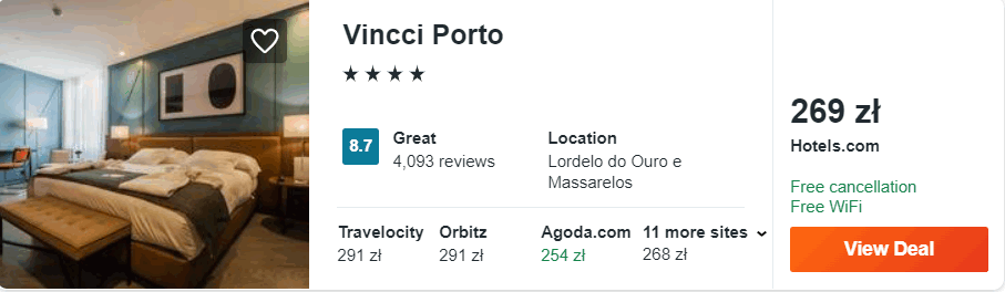 Natomiast w Porto proponuję wam noclegi w 4* hotelu Vincci, który położony jest nad brzegiem rzeki Duero. Wszystkie pokoje zostały urządzone w eleganckim stylu, każdy z nich posiada łazienkę z prysznicem i suszarką do włosów.