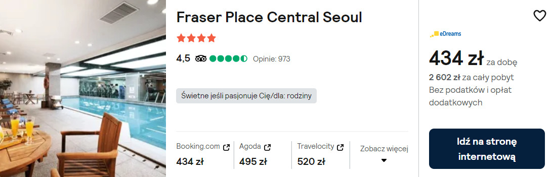 Natomiast w stolicy Korei Południowej postaw na pobyt w 4* hotelu Fraser Place Central Seoul z krytym basenem i dostępem do sieci WiFi we wszystkich pomieszczeniach. Każde studio składa się aneksu kuchennego, miejsca do relaksu i spania oraz łazienki.