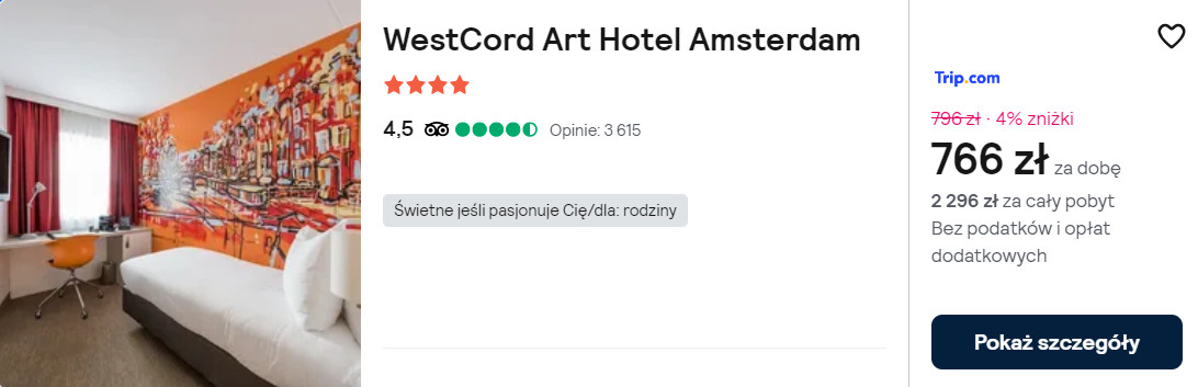 Natomiast w Amsterdamie rozważ propozycję noclegów w 3* hotelu WestCord Art. Każdy pokój wyposażony jest w klimatyzację z funkcją ogrzewania, telewizor LCD, minibar oraz czajnik elektryczny. W łazience jest prysznic, suszarka do włosów oraz podstawowe przybory toaletowe.