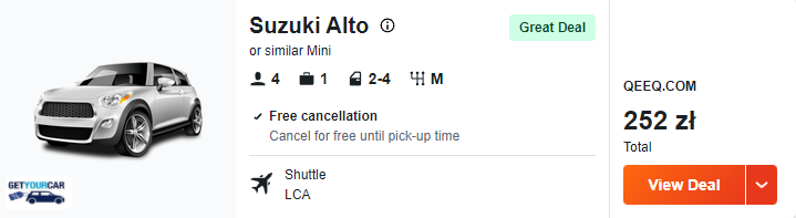 Chcecie zobaczyć więcej? W takim razie wypożyczcie samochód na lotnisku w Larnace i ruszcie odkrywać wspaniały Cypr. Za wynajem Suzuki Alto lub podobnego modelu zapłacicie w sumie 252 PLN.
