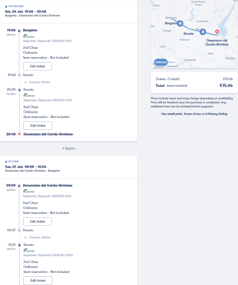 Nad Gardę dostaniecie się pociągami Trenitalia. Za podróż w dwie strony zapłacicie niecałe 16 EUR (74 PLN, stan na dzień 24.04.2022 r.).
