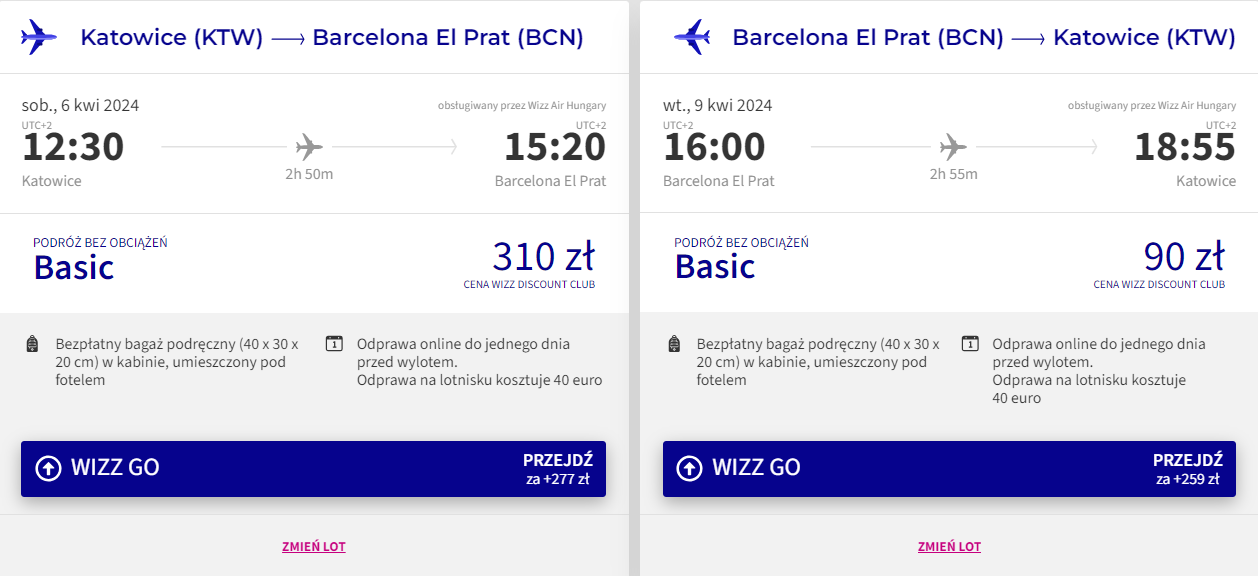 Do stolicy Katalonii udasz się z portu lotniczego Katowice-Pyrzowice w terminie 6-9 kwietnia (sobota-wtorek). W obie strony podróżować będziesz linią Wizz Air z bagażem podręcznym. Bilety w najniższej cenie dostępne są dla członków Wizz Discount Club. Chętni na loty bez WDC zapłacą więcej.