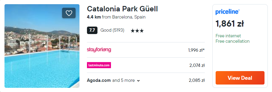W Barcelonie proponuję ci noclegi w 3* hotelu Catalonia Park Güell z basenem na dachu. Każdy pokój został wyposażony w klimatyzację oraz telewizor LCD. W łazience jest prysznic i suszarka do włosów. Na terenie całego obiektu będziesz miał zapewniony dostep do sieci WiFi.