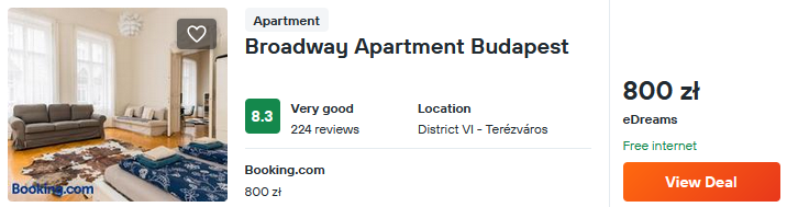 W Budapeszcie rekomenduję noclegi w bardzo dobrze ocenianym apartamencie Broadway. Obiekt oferuje swoim gościom dostęp do w pełni wyposażonej kuchni, klimatyzację oraz bezpłatne WiFi.