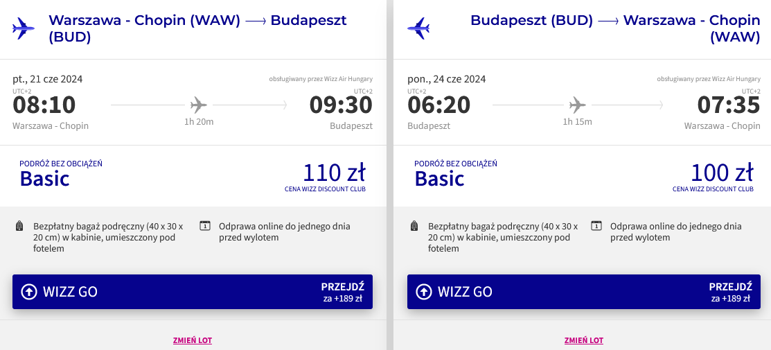 Do Węgier polecisz w terminie 21-24 czerwca (piątek-poniedziałek) z warszawskiego lotniska im. Fryderyka Chopina. Podróż odbędziesz linią lotniczą Wizz Air. W cenę biletu wliczony został bagaż podręczny.