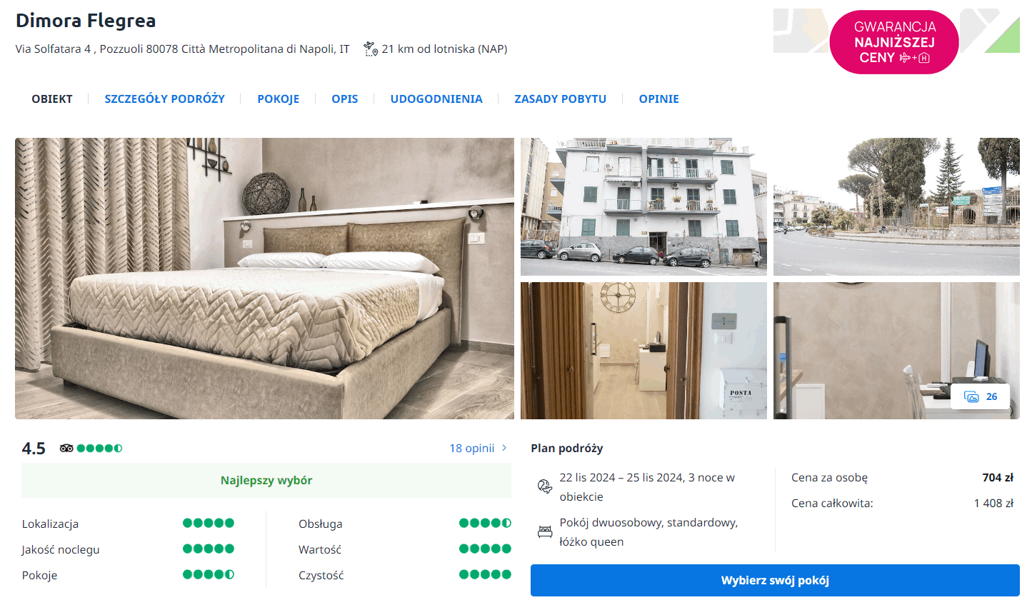 We włoskim mieście zatrzymasz się w kompleksie apartamentów Dimora Flegrea, który znajduje się pomiędzy stacją metra (Pozzuoli Solfatara) a dworcem (Pozzuoli). Każdy pokój wyposażony jest w klimatyzację, telewizor, lodówkę oraz czajnik elektryczny. W łazience jest prysznic, suszarka do włosów oraz podstawowe przybory toaletowe. Na terenie całego obiektu będziesz miał zapewniony dostęp do sieci WiFi.