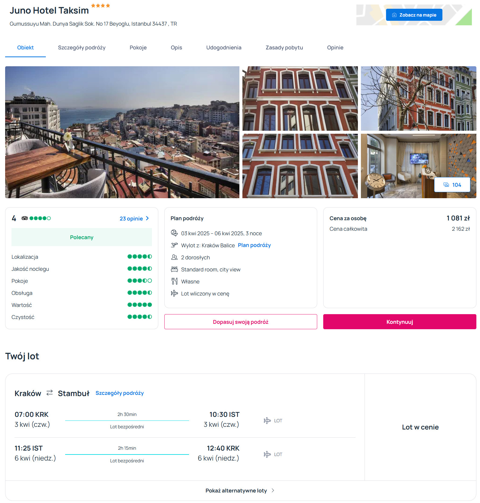 W Stambule zatrzymasz się w bardzo dobrym 4* hotelu Juno Taksim, który znajduje się w odległości 200 metrów od placu Taksim. Każdy pokój wyposażony jest w klimatyzację, telewizor LCD, lodówkę oraz czajnik elektryczny. W łazience jest prysznic, suszarka do włosów oraz podstawowe przybory toaletowe. Na terenie obiektu zapewniony będziesz miał dostęp do sieci WiFi