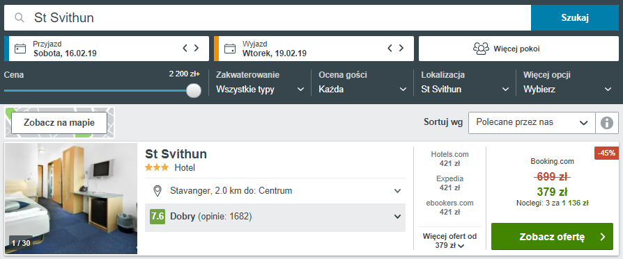 Przeloty realizowane są na pokładzie węgierskiej linii lotniczej Wizz Air. Aby uzyskać taką cenę, musisz być członkiem Wizz Discount Club. Hotel St Svithun znajduje się obok szpitala uniwersyteckiego w Stavanger, niedaleko Jeziora Mosvannet i oferuje internet WiFi. Goście mają do dyspozycji nowoczesne, klimatyzowane i ogrzewane pokoje, w których znajduje się prywatna łazienka z prysznicem. Rezerwując przez pośrednika booking.com zapłacicie 1139 PLN za 3 noce zapłacicie 1139 PLN/4 os.