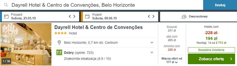 Przeloty realizowane są na pokładzie linii lotniczej Air France. W Belo Horizonte proponuję Wam zakwaterowanie w 4* Dayrell Hotel & Centro de Convenções. Obiekt położony jest w centralnej części miasta i wyróżnia się dogodną lokalizacją. Hotelowy taras wyposażony jest w basen, saunę i centrum fitness, a z baru można podziwiać zapierający dech w piersiach widok na Serra do Cural. W całym obiekcie można bezpłatnie korzystać z WiFi. Pokoje są wygodne i przestronne i wyposażone w klimatyzację, minibar, sejf, biurko i telewizję kablową. Do ceny wliczone są śniadania.