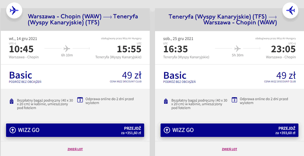 Na największą wyspę archipelagu Wysp Kanaryjskich udacie się z warszawskiego lotniska im. Chopina. W obie strony podróżować będziecie bezpośrednio na pokładach samolotów linii Wizz Air, a za bilety w dwie strony zapłacicie tylko 98 PLN! W takiej cenie polecą członkowie Wizz Discount Club, chętni na loty bez WDC zapłacą nieco więcej.