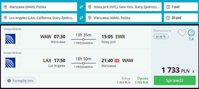 United Airlines | Warszawa 07:30 – Nowy Jork 15:05 | 1733 PLN | 1 października