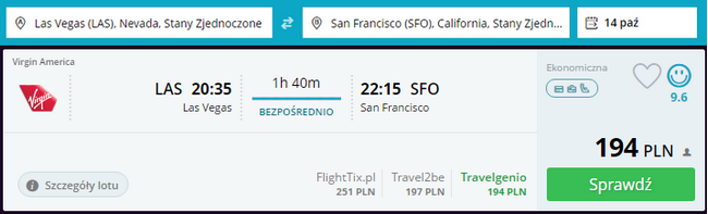 Virgin America | Las Vegas 20:35 – San Francisco 22:15 | 194 PLN | 14 października