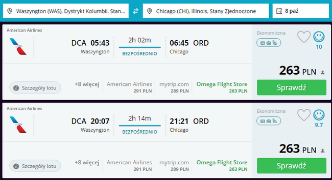 American Airlines | Waszyngton 05:43 – Chicago 06:45 | 263 PLN | 8 października