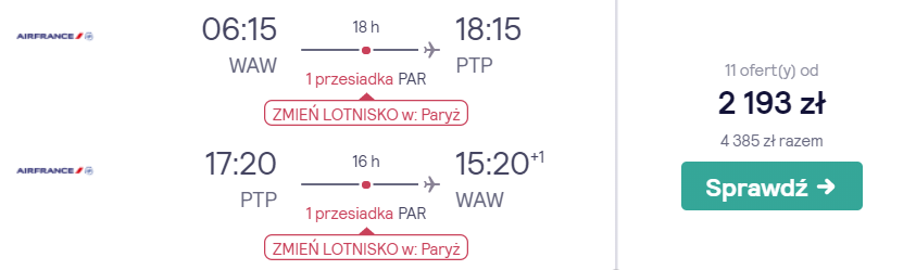 Wasza wycieczka zaplanowana została na termin 1 – 8 czerwca. Wylecicie z Warszawy na pokładzie samolotów linii lotniczych Air France, a na Gwadelupę dotrzecie z przesiadkami w Paryżu. We francuskiej stolicy czeka was zmiana lotniska (zapewnia ją bezpłatnie linia lotnicza).