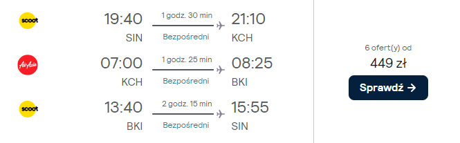 Następnie korzystając z usług lokalnych niskokokosztowych przewoźników Scoot oraz AirAsia, zarezerwuj loty na trasie Singapur – Kuching – Kota Kinabalu – Singapur. Bez dodatkowych opłat możesz zabrać ze sobą sam bagaż podręczny.