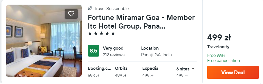 W stanie Goa wybrałem dla ciebie noclegi w 5* hotelu Fortune Miramar. Obiekt zlokalizowany jest w pobliżu plaży.