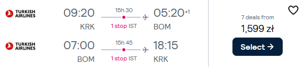 Do Azji udasz się 26 lutego z Krakowa. Do kraju wrócisz 17 marca. Czekają cię loty linią Turkish Airlines z przesiadkami w Stambule. Po przylocie do Mumbaju odwiedzisz jeszcze Nowe Delhi, Kalkutę i Goa.