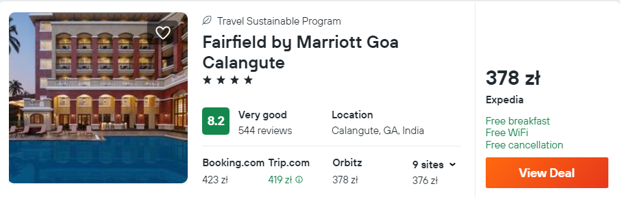 W stanie Goa proponuję pobyt w 4* hotelu Fairfield by Marriott Goa Calangute. Na miejscu będziesz zakwaterowany w nowoczesnym pokoju. Obiekt posiada basen zewnętrzny i siłownię.