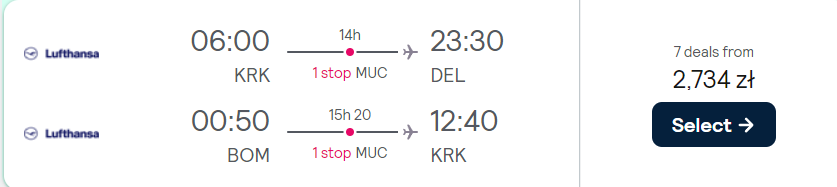 Do Indii wybierzesz się w terminie 11-28 maja. Podróżować będziesz z Krakowa pokładzie samolotów linii lotniczej Lufthansa z przesiadkami w Monachium. Na miejscu czekają cię dwa loty wewnętrzne: 18 maja z Nowego Delhi do Goa oraz 25 maja do Mumbaju. W Azji skorzystasz z usług przewoźnika AirAsia. Pamiętaj też, że bez dodatkowych opłat możesz zabrać jedynie bagaż podręczny.