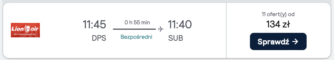 Podróżować będziesz na pokładach samolotów Air China, TransNusa, Lion Air i Citilink. W chińskich liniach lotniczych w cenę wliczony jest bagaż rejestrowany. W pozostałych połączeniach przysługuje wyłącznie podręczny.