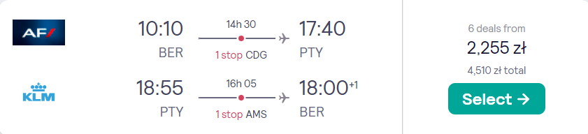 Do Panamy polecisz z lotniska w Berlinie w terminie 16-25 czerwca na pokładzie samolotów linii lotniczych Air France i KLM. Po drodze czekają cię bezpieczne przesiadki w Paryżu i Amsterdamie. Bez dodatkowych opłat zabierzesz ze sobą bagaż podręczny i przedmiot osobisty.